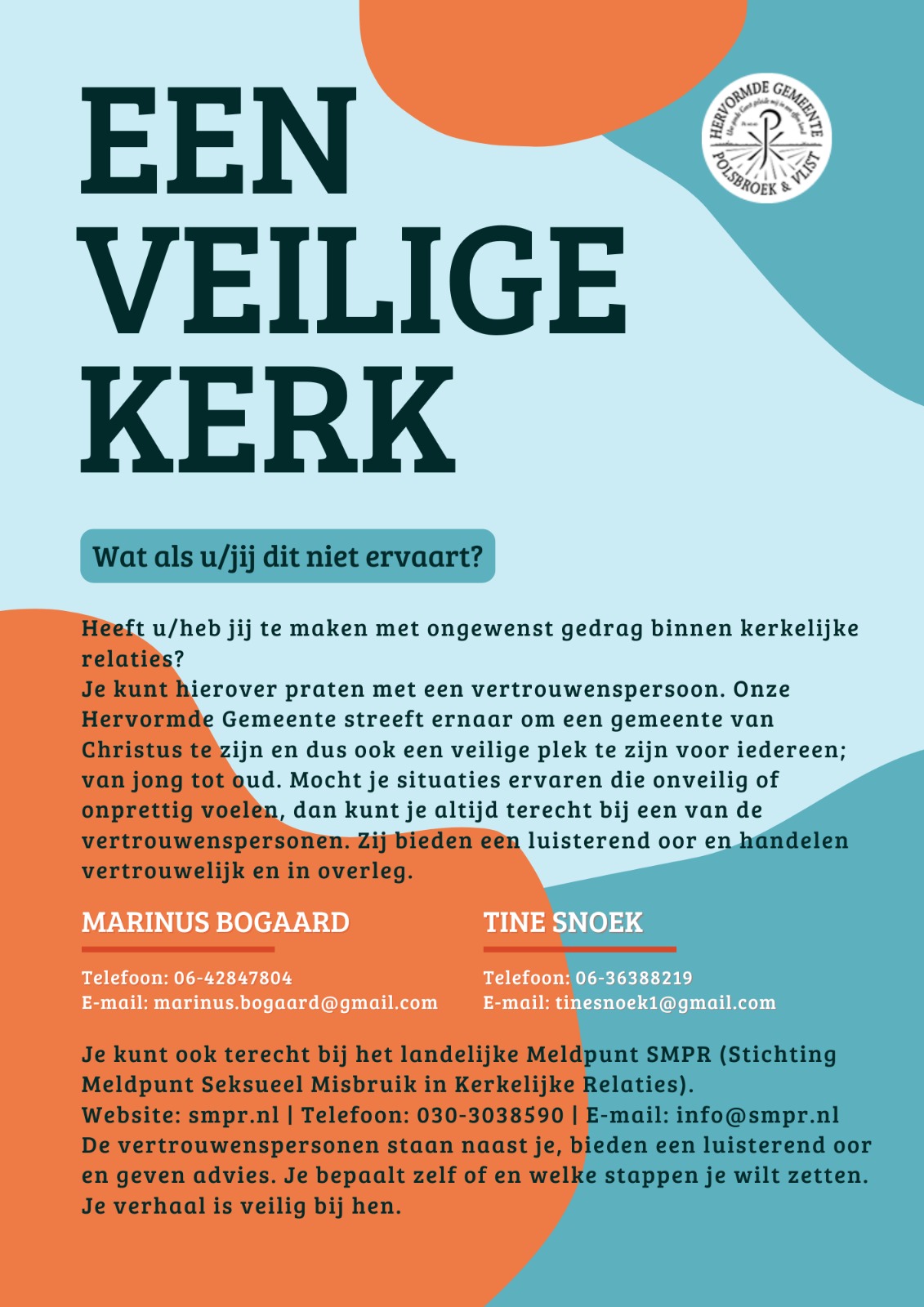 We willen dat u en jij zich veilig kunt voelen in de Hervormde gemeente Polsbroek en Vlist. Veilig om te zijn wie u of jij bent. Veilig om uw en jouw geloof te beleven. Maar ook om nare en vervelende dingen bespreekbaar te maken. Die je zijn overkomen of die je gesignaleerd hebt binnen onze gemeente. We zijn erop gericht om voor iedereen een veilige kerk te zijn. Dat betekent: